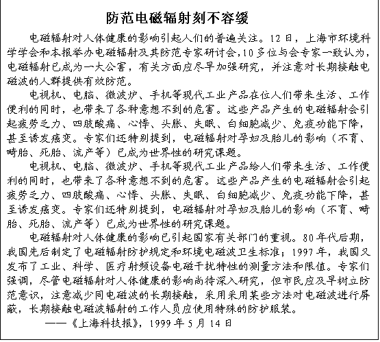在您看電視的時候,您也許不會料到比高壓電纜所產(chǎn)生的電磁波還要強的電磁輻射正籠罩著您;在您用移動電話談妥一宗生意的時候,您不會想到手機天線集中釋放的電磁波已經(jīng)進入了您的體內(nèi)……